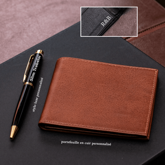 COFFRET LUXE STYLO ET PORTEFEUILLE PERSONNALISÉ MARRON